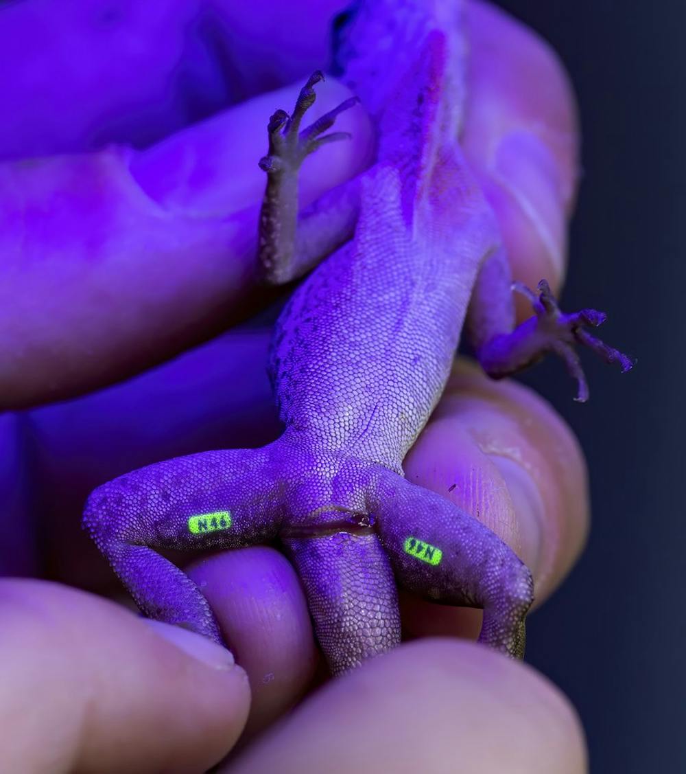 The identification code lets researchers track the lizard’s growth and survival. Neil Losin/Day's Edge Prods.As afternoon approaches, the team relocates each piece of bright pink tape and returns the corresponding lizard to the exact branch it was caught on. The anoles now sport two tiny 3-millimeter tags with a unique code that lets us identify it when we recapture it in future research trips, along with a small dot of white nail polish so we know not to catch it immediately after we let it go.