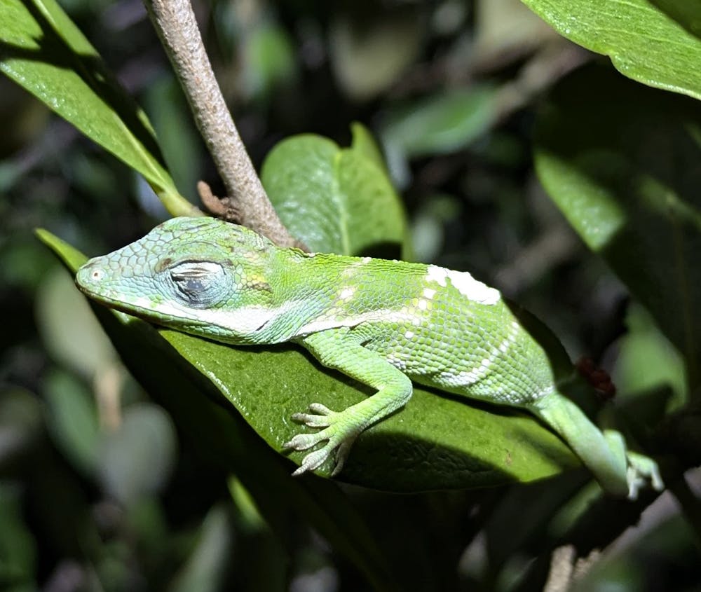 As the morning heat builds, we spot our first lizards: Cuban brown anoles near to the ground, and the mottled scales of Hispaniolan bark anoles just above them. Further up, in the leafy tree canopies, are American green anoles, and the largest species, the Cuban knight anole, about the size of a newborn kitten.