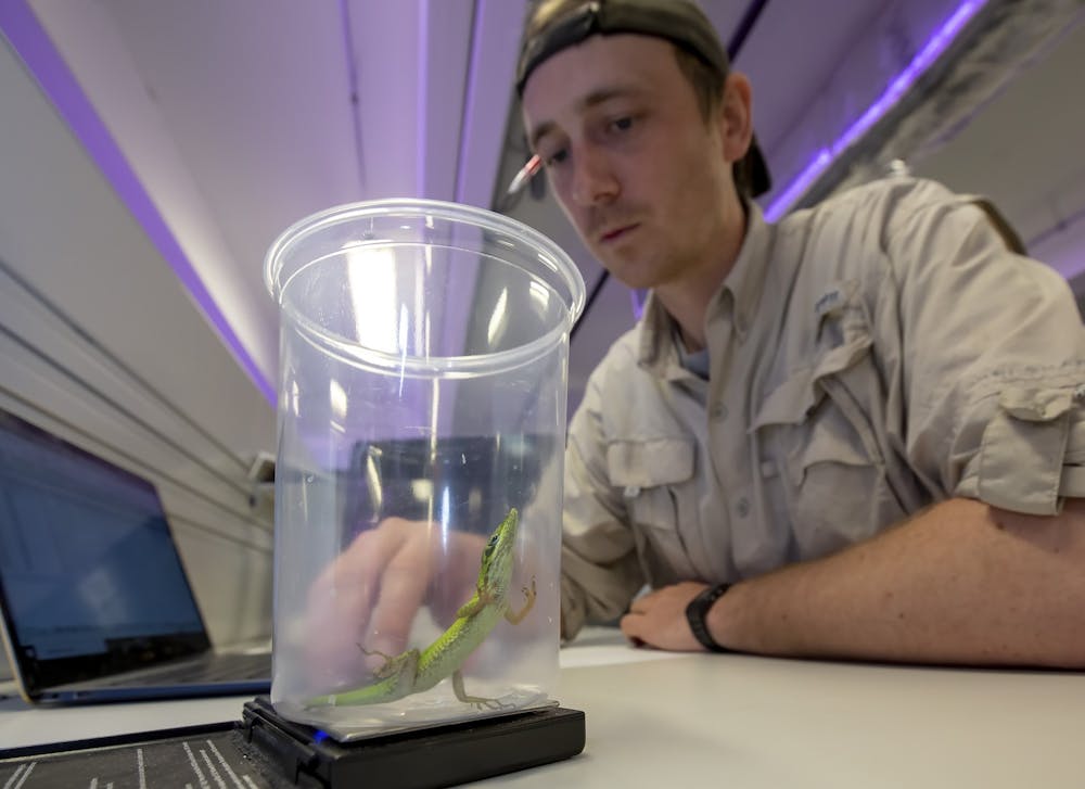 In the laboratory, Stroud weighs a green anole. Neil Losin/Day's Edge Prods.The Lizard Olympics