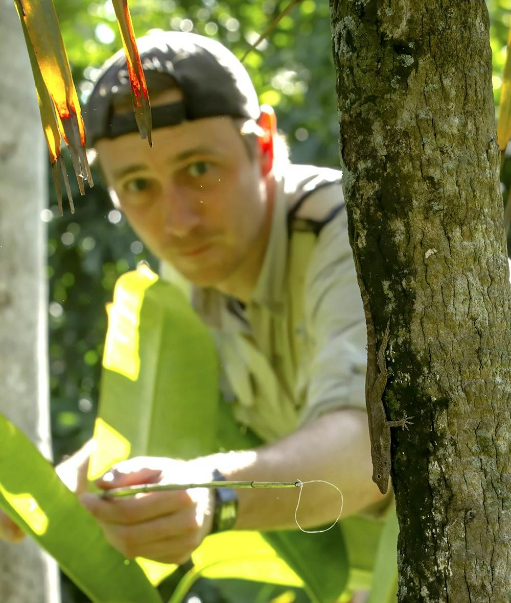 Catching an anole with a lizard lasso. Look closely – the anole blends in quite well with the tree. Neil Losin/Day's Edge Prods.Tiny Fishing Poles
