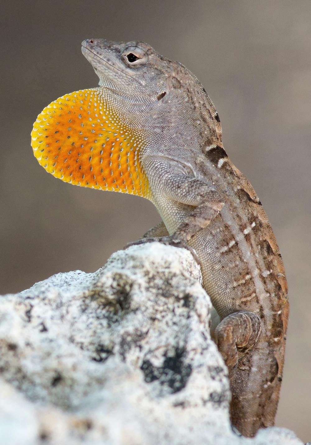 Anoles communicate with their dewlap, an expandable throat fan that signals other lizards. Jon SuhThe Lizard Olympics is helping us understand why. The larger, more aggressive crested anoles are forcing brown anoles to spend more time on the ground, where those with longer legs might run faster to escape predators – allowing them to better survive and pass on their long-leg genes, while shorter-legged anoles might be eaten before they can reproduce.